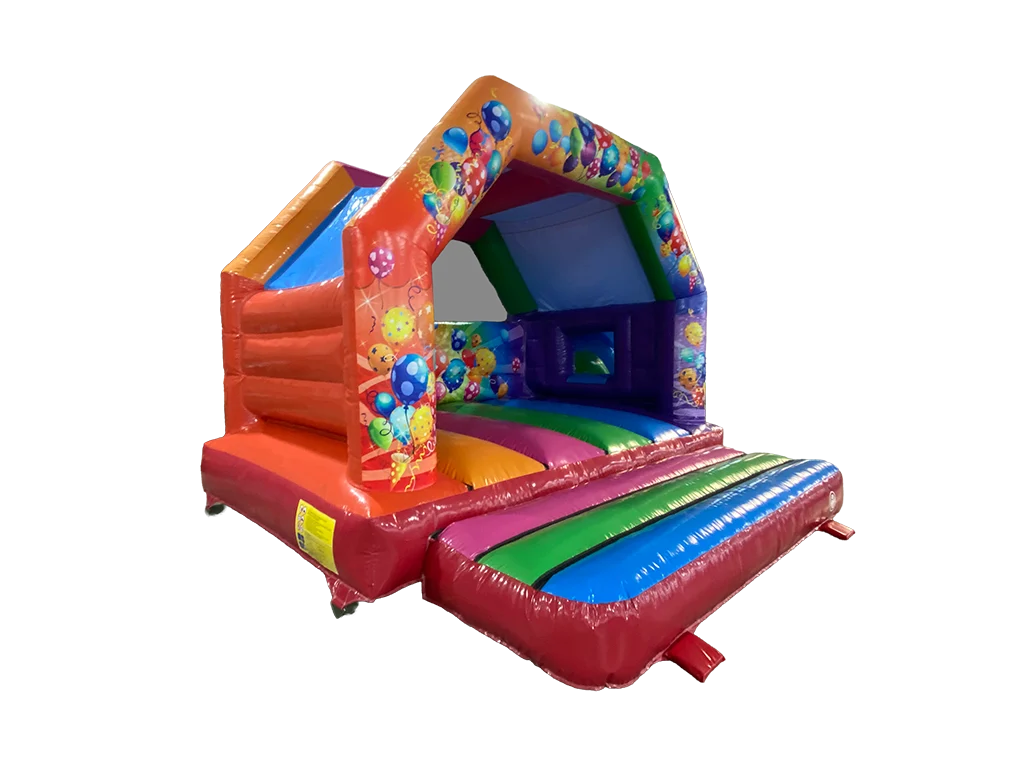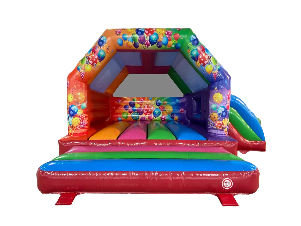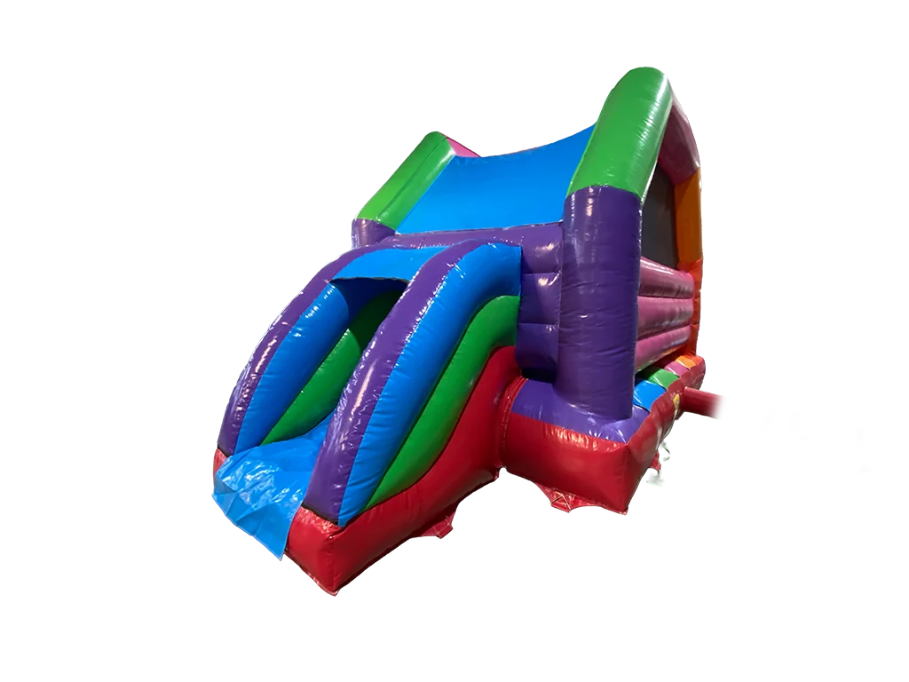 Värikäs Party- pomppulinna on todella näyttävä juhlien keskipiste ja sivussa oleva liukumäki tuo lisäohjelmaa pomppimiseen. Tämä vuokrattava pomppulinna sopii täydellisesti koulujen liikuntapäiviin, urheilutapahtumiin, synttäreille ja yritysjuhliin.