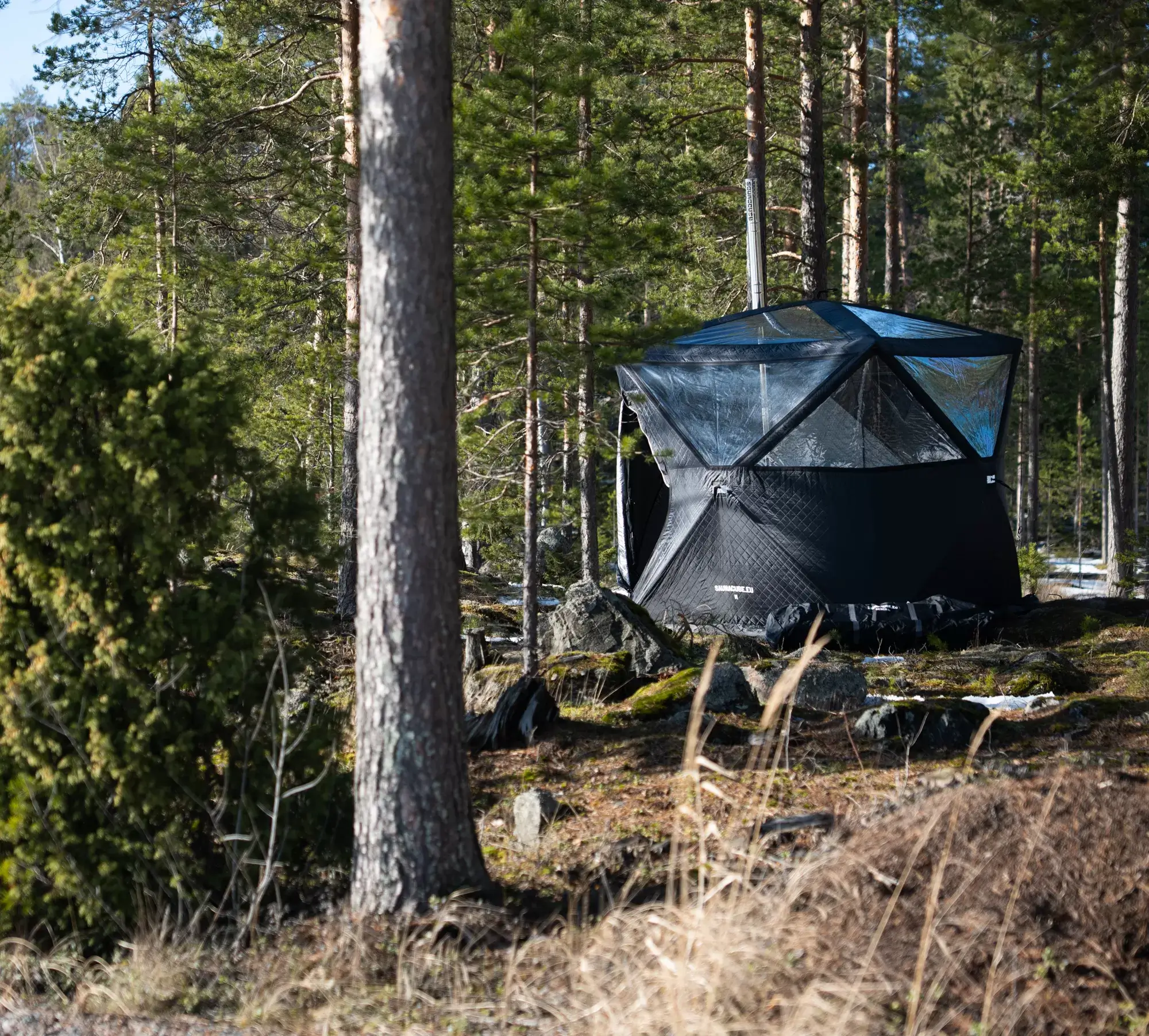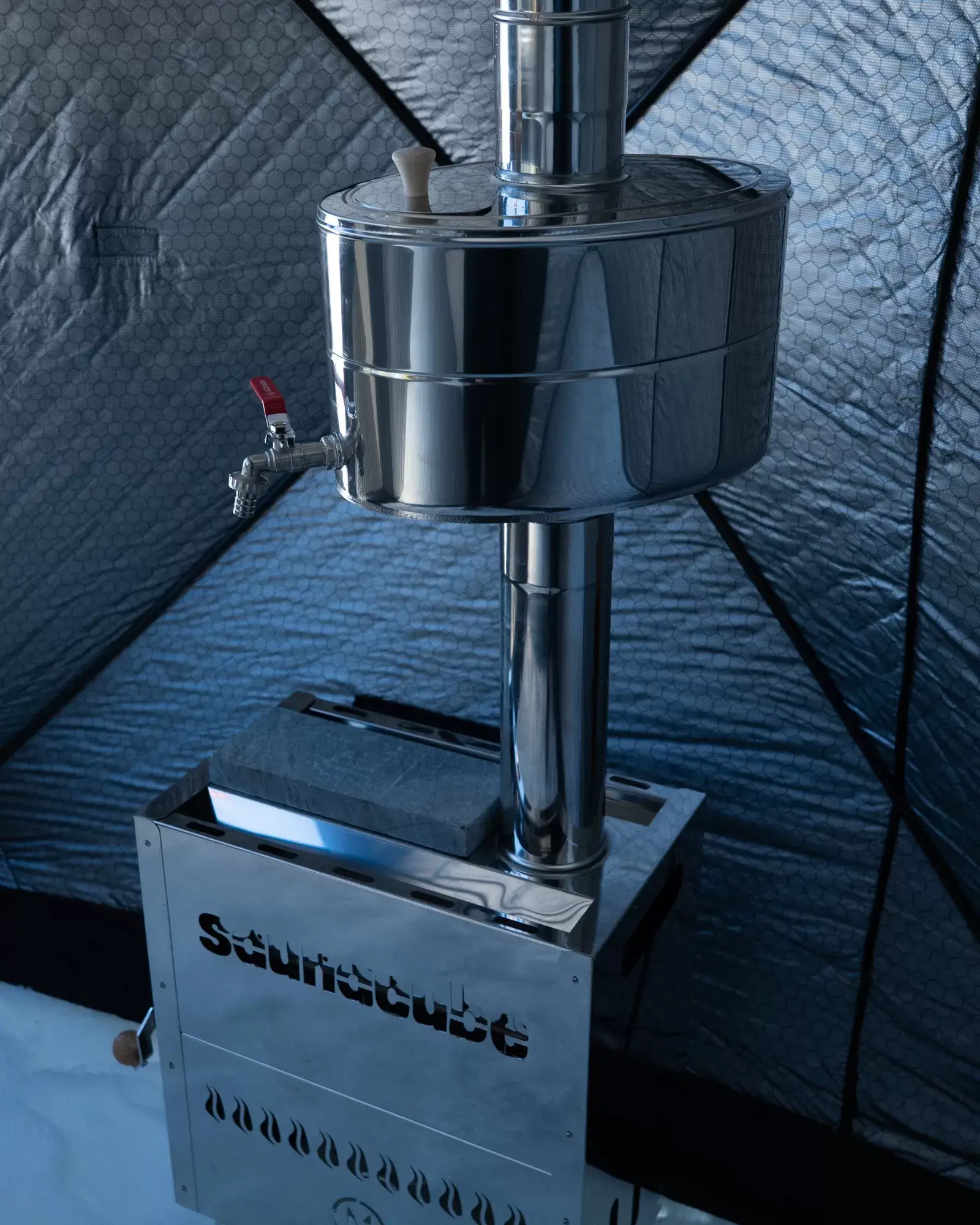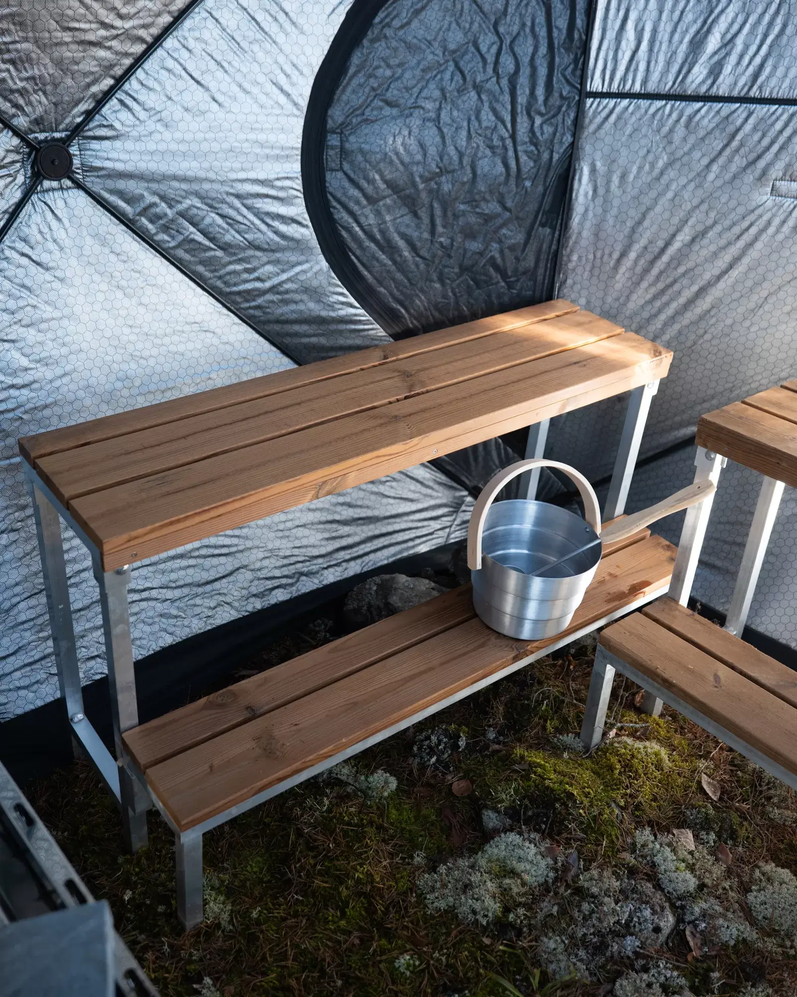 🔥 Mukana kaikki tarvittava – vuokraus sisältää telttasaunan lisäksi kamiinan 25 L lämminvesivaraajalla ja vuolukivellä sekä lauteet. Kaikki pakattuna kantokasseihin.