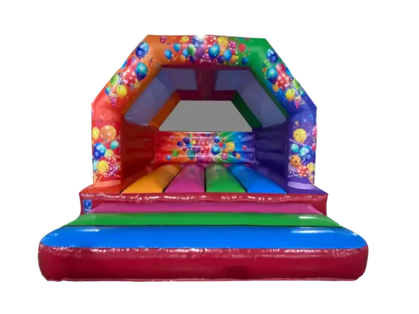 Juhla teemainen pomppulinna, jossa värikkäät ilmapallot luovat iloisen ja juhlallisen ilmapiirin. Sopii erinomaisesti lasten juhliin, tapahtumiin ulko sekä sisätiloihin.